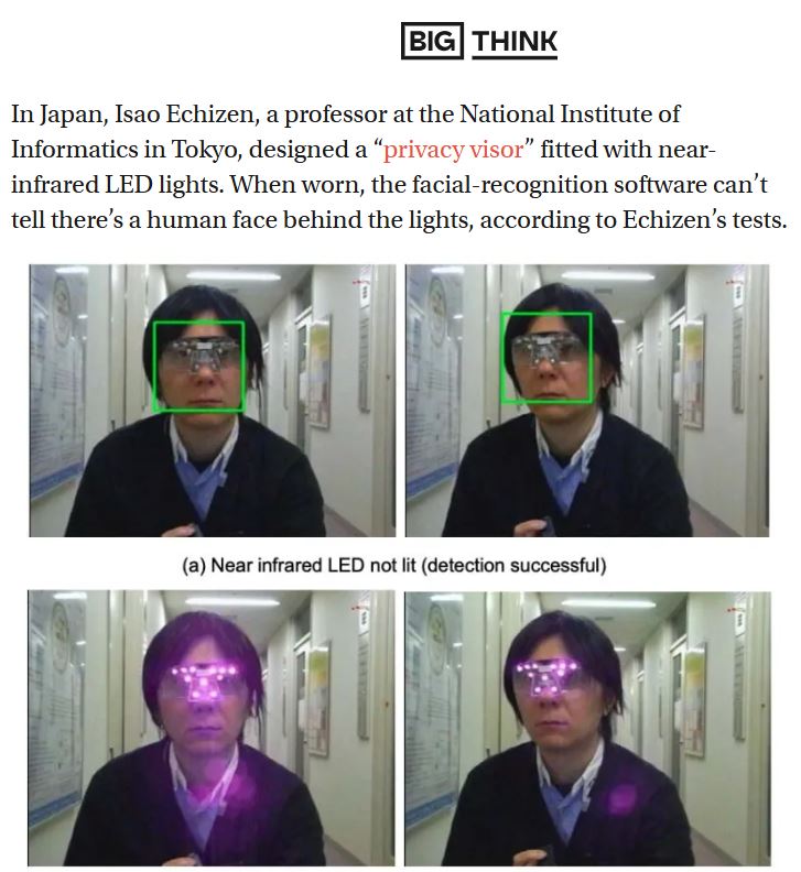 In realtà non è certo il primo “tentativo di ribellione”: di invenzioni per proteggere il volto ce ne sono molte, ma per lo più sono accrocchi (sotto un esempio in foto). Ciò che vale la pena di provare è il cappuccio della felpa con i mini led a contorno della testa che “bruciano” l’immagine del volto facendo vedere tutto bianco o tutto nero a chi spia.